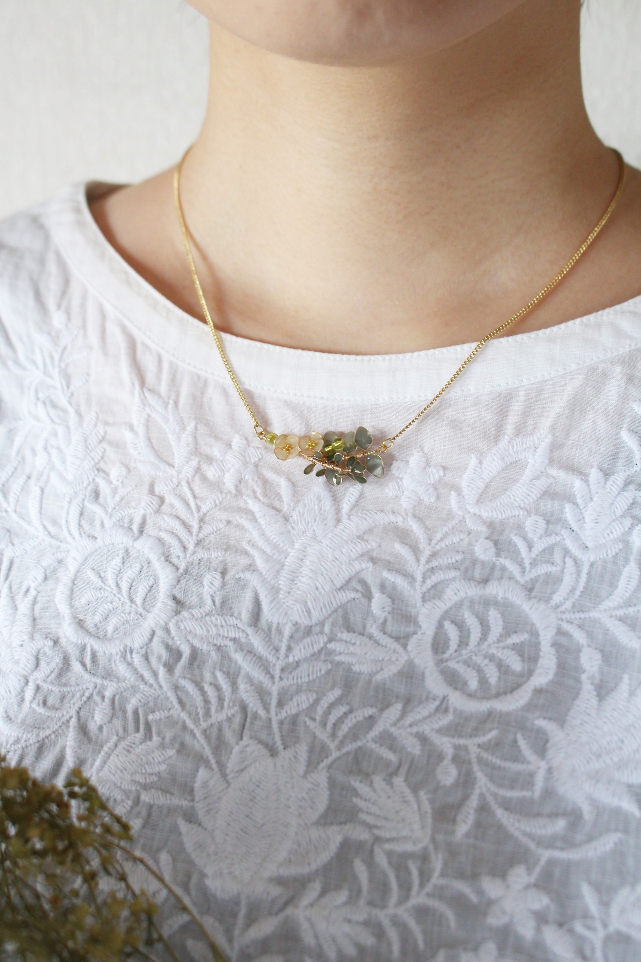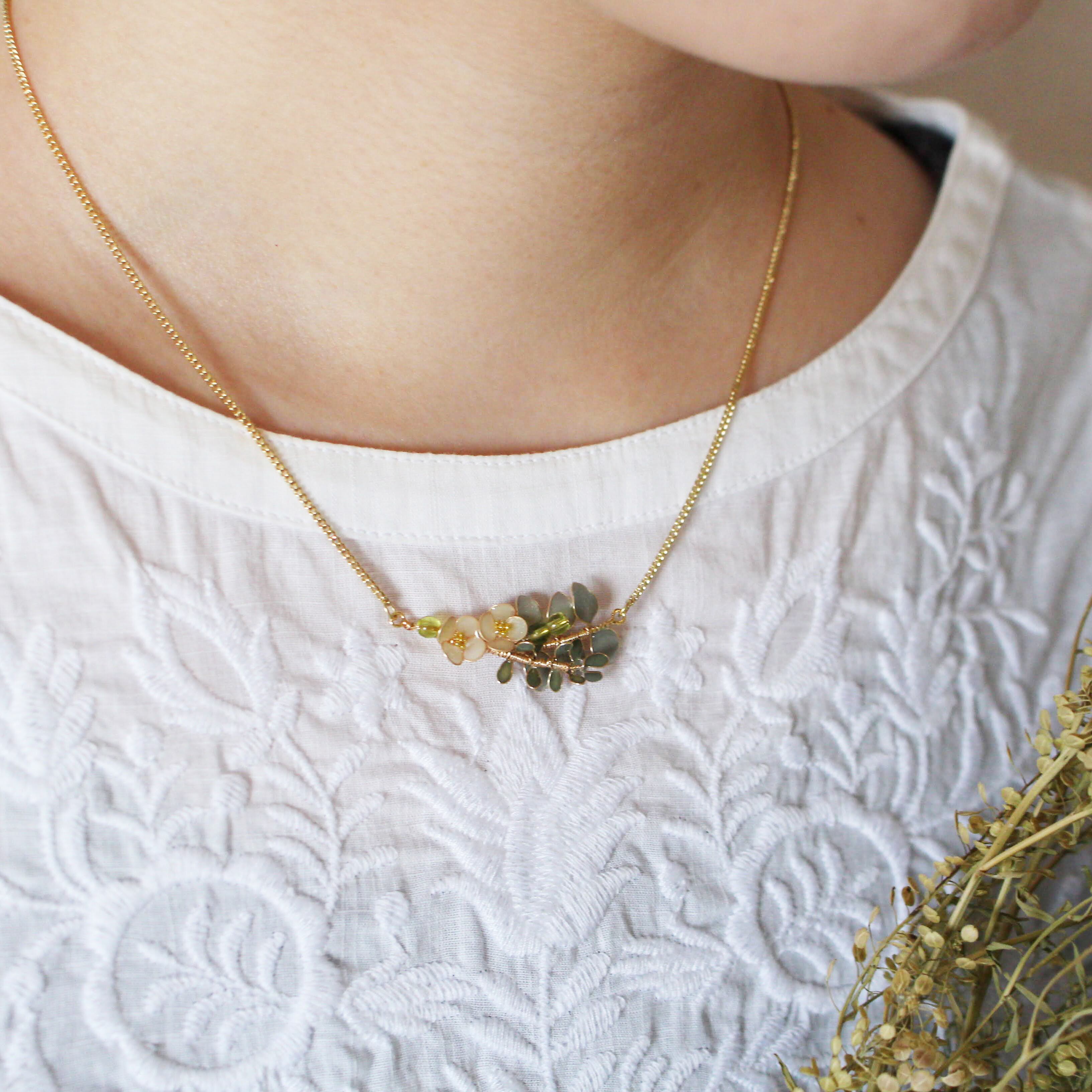 軽く繊細なグリーンを、多種類集めて束ねたネックレスです。