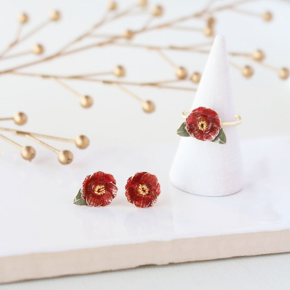 軽く繊細な赤椿の小花を、耳元と指元でお楽しみいただけるセットです。